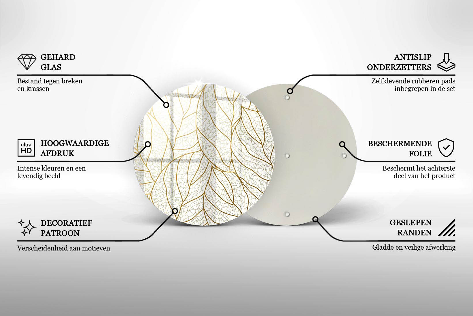 Materiaal: kleurloos gegoten acryl (PMMA) met bedrukking op de onderste laag