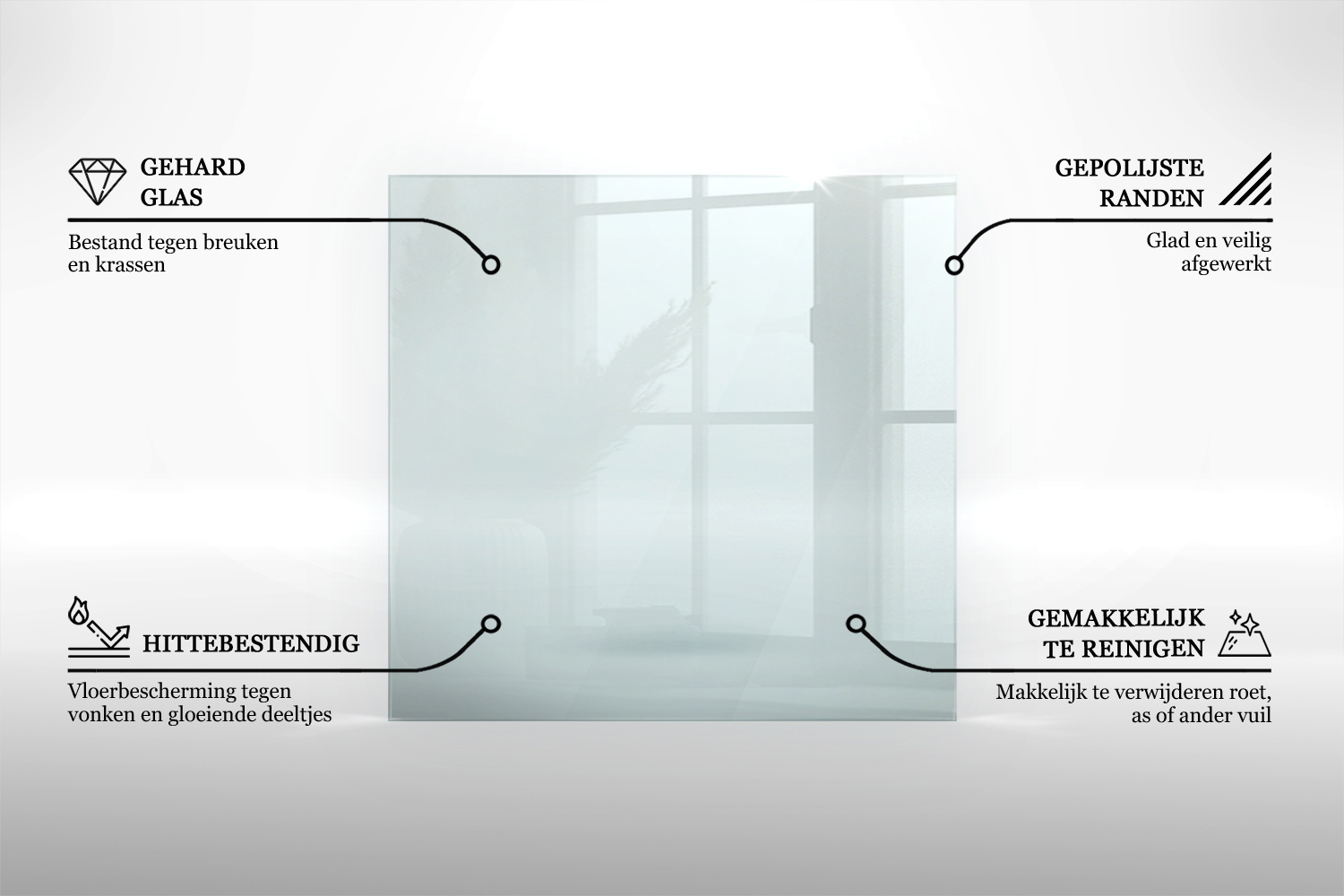 De geslepen randen zorgen voor een subtiele afwerking zonder scherpe hoeken, zodat de onderplaat kachel veilig en aangenaam oogt in de woonkamer. Met zijn weerbestendige eigenschappen is gehard glas bovendien een duurzame keuze waar je jarenlang plezier van hebt.